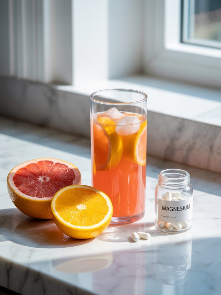 Coconut water + magnesium + citrus replenishes fluids and supports muscle and nerve function.