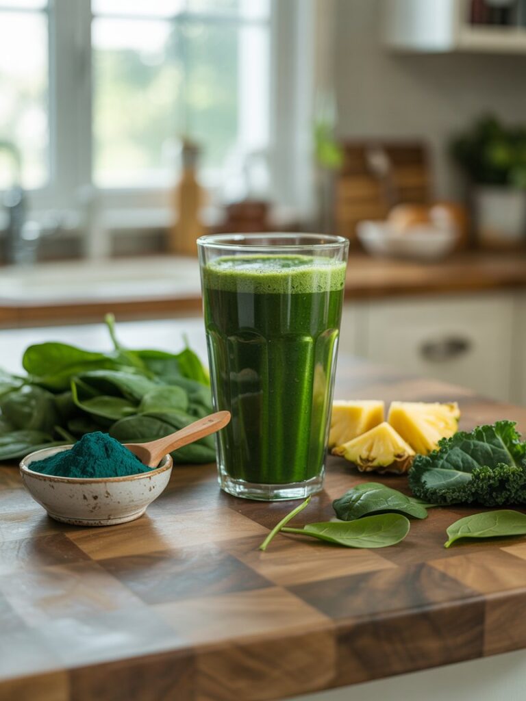 Leafy greens + spirulina + pineapple provide antioxidants and minerals that support steady energy without caffeine crashes.