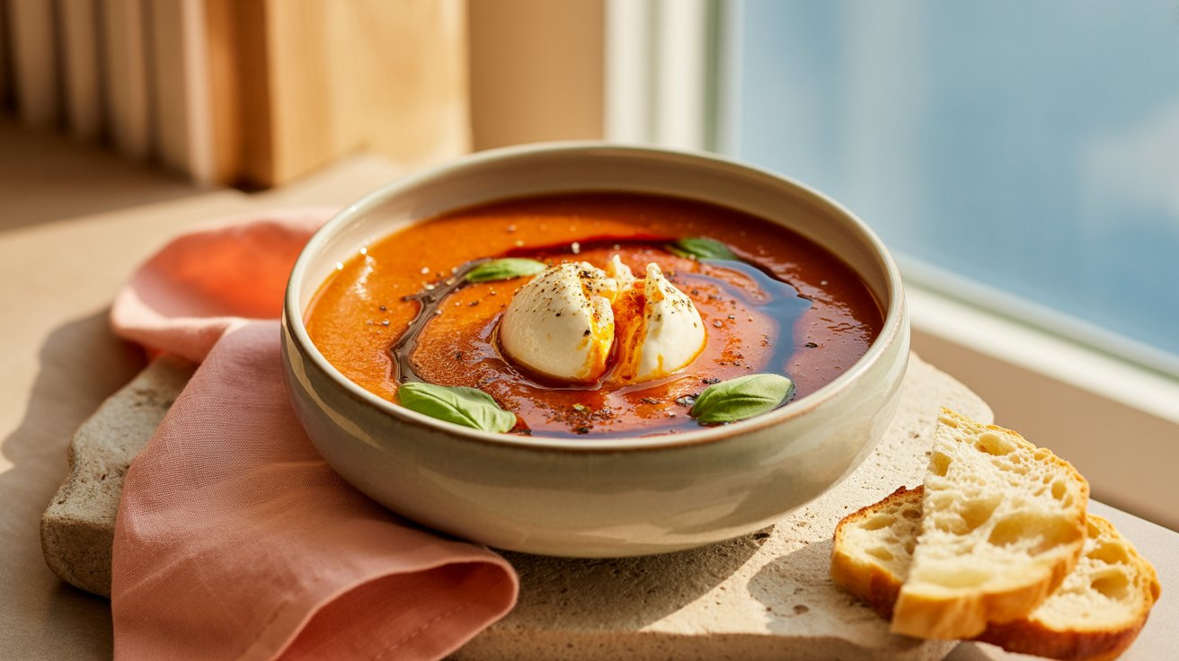 This version is deeper, silkier, and just dramatic enough to serve at a dinner party — yet easy enough for a Tuesday night in soft pants. Roasting concentrates the tomatoes into something almost jammy. Burrata melts into creamy pools. A drizzle of chili oil adds that quiet heat that makes you go back for another spoonful.