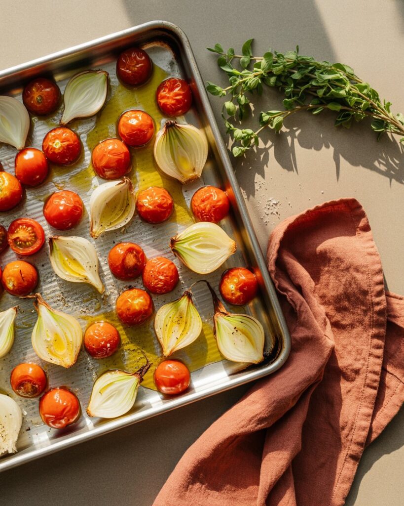 Roast for 30–40 minutes until tomatoes collapse and edges caramelize slightly.